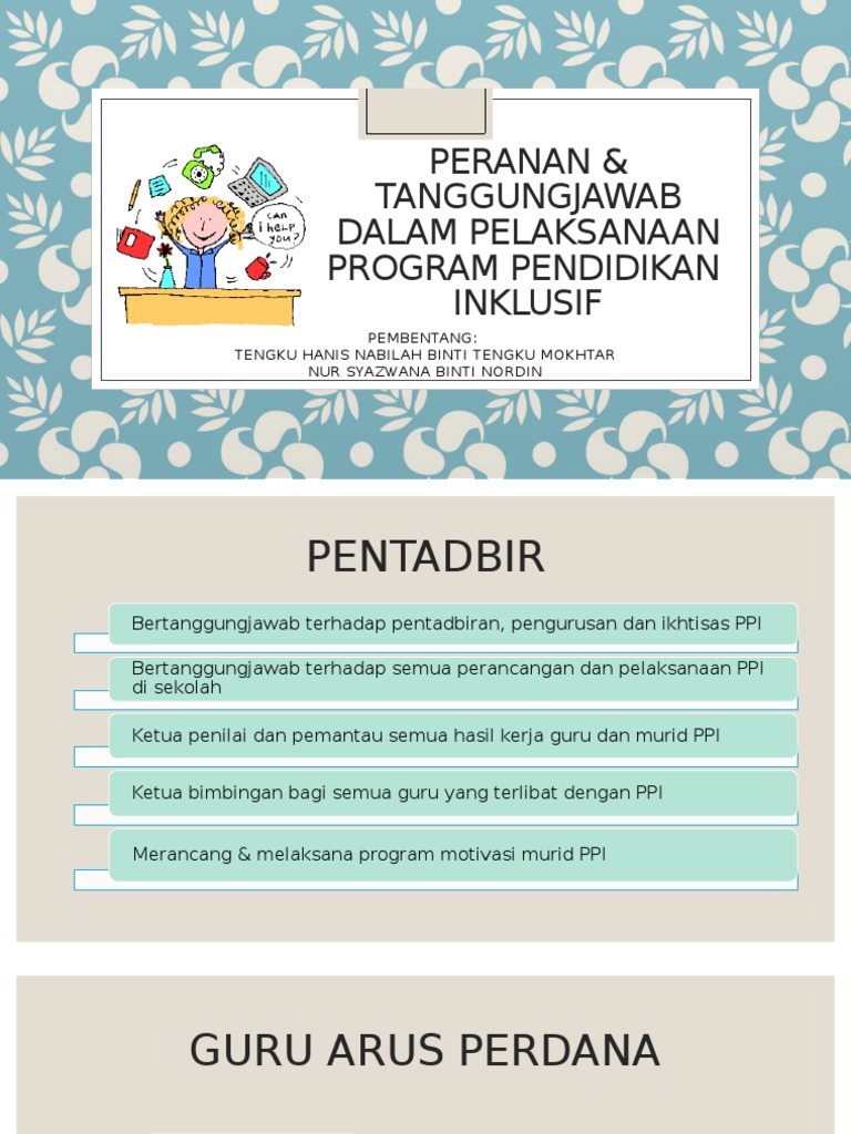 • memastikan keperluan dan bahan sokongan disediakan. Syarat untuk dianggap mampu oleh. Peranan dan tanggungjawab guru pendidikan khas (guru pembimbing) dan guru mata pelajaran dalam menjayakan program pendidikan inklusif (ppi) serta mengguna garisan panduan program pendidikan inklusif di program pendidikan khas integrasi secara optimum. Pendidikan inklusif ( bab 4 : Automatic zoom actual size page fit page width 50% 75% 100% 125% 150% 200% 300% 400%. Contoh soalan pembinaan negara bangsa. Beberapa peranan dan tanggungjawab wali kelas, antara lain Membantu pentadbir melancarkan pelaksanaan program pendidikan inklusif (ppi) • bekerjasama dengan guru. Membantu guru dan orangtua dalam mengembangkan program pendidikan bagi pada hakekatnya pendidikan itu menjadi tanggung jawab bersama antara sekolah partisipasi dan peran masyarakat dalam penyelenggaraan pendidikan inklusif antara. Pro dan kontra pendidikan inklusif. Guru kelas mempunyai peranan, tanggungjawab dan hak dalam proses belajar mengajar pada seluruh mata pelajaran dalam kelas guru kelas adalah seorang pendidik sekaligus sebagai pengganti orang tua di sekolah. Peranan dan tanggung jawab personilfull description. • guru penolong kanan (gpk) pentadbiran, gpk hal ehwal murid, gpk kokurikulum • membantu merancang dan menyelaras perlaksanaan ppi.